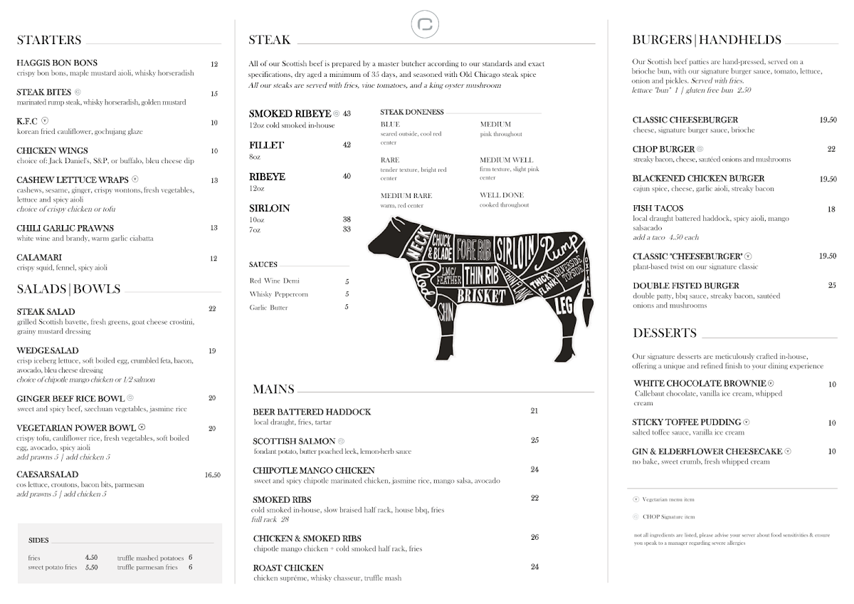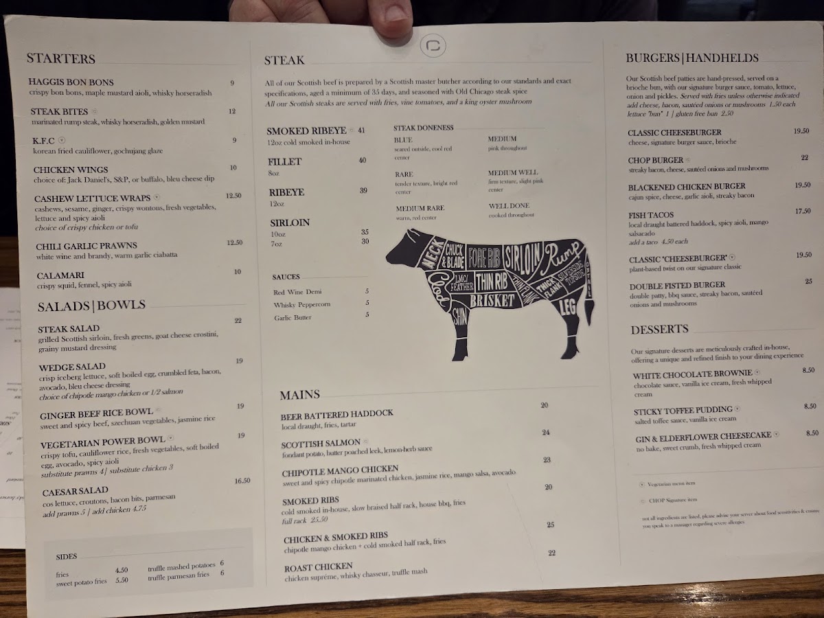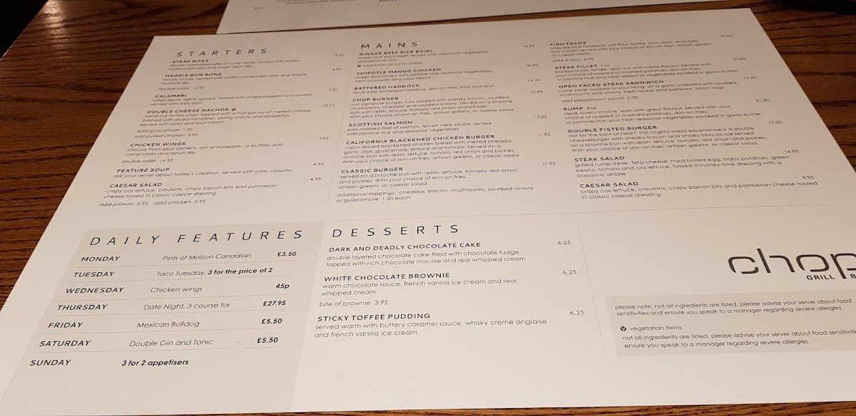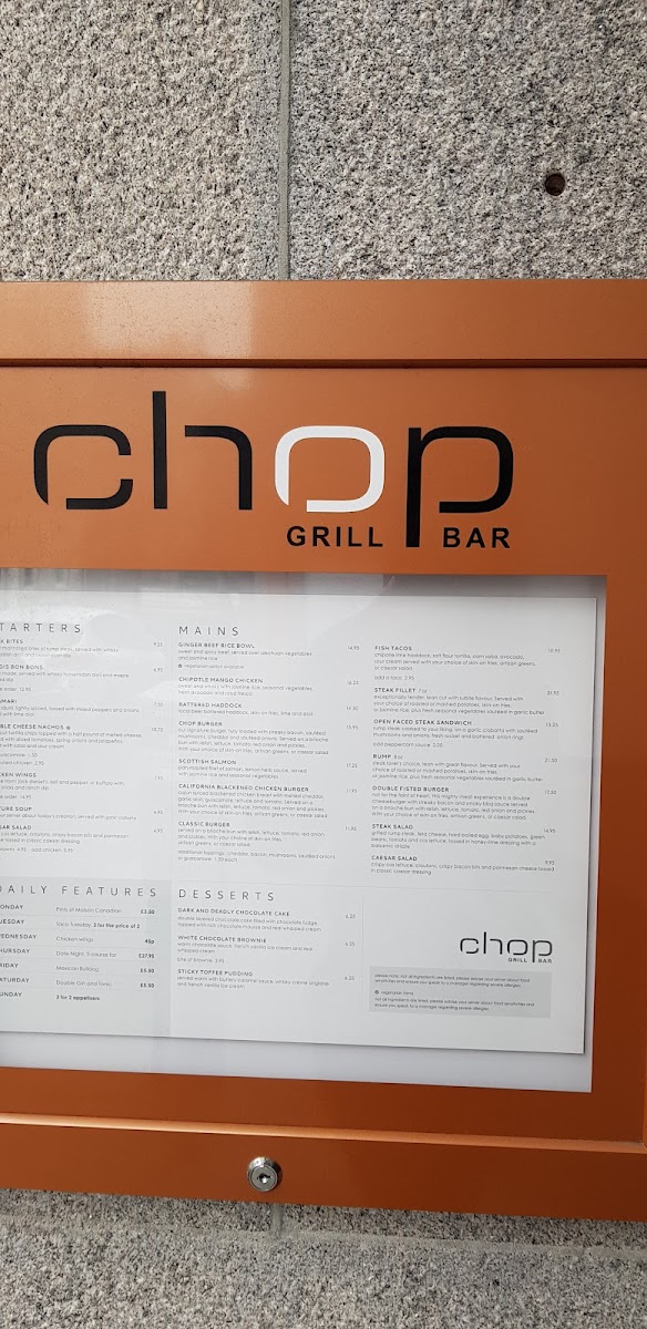 The menu at Chop Grill & Bar offers a wide array of dishes, showcasing both hearty and lighter options. For those starting with appetizers, the Steak Bites and Mini Mac Sliders are popular choices, as well as the Chilli Garlic Prawns and Calamari. Soups like the Seafood Chowder and fresh salads including the Caesar Salad and Steak Salad complement the more filling mains. Steak lovers can indulge in cuts like the Rump (8oz), Fillet (7oz), and the tender Ribeye (12oz), with specialties such as Teriyaki Rump (8oz) and Smoked Ribeye (12oz) for a unique twist. If you're in the mood for something else, their selection of mains includes Chipotle Mango Chicken, Battered Haddock, and Smoked Baby Back Ribs, alongside the popular Chicken & Ribs and Scottish Salmon. The burger menu is equally diverse, offering the Classic Burger, Chop Burger, and the indulgent Double Fisted Burger, with vegetarian options like the Veggie Burger and California Blackened Chicken Burger. For those seeking handheld delights, the Fish Tacos, Canadian Clubhouse, and Open Faced Steak Sandwich are favorites. To satisfy your sweet tooth, the restaurant serves New York Cheesecake, Dark & Deadly Chocolate Cake, White Chocolate Brownie, and the traditional Sticky Toffee Pudding, with a side of Local Ice Cream. For the younger crowd, the menu also caters with kid-friendly options like Pasta, Cheeseburger, and Chicken Tenders. With such a diverse menu, Chop Grill & Bar offers something for every taste, making it a great dining choice in Aberdeen.